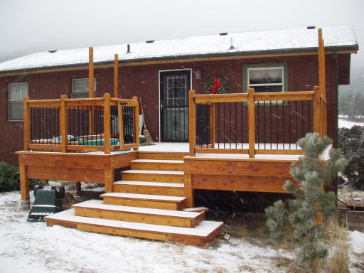 Scot has also handmade this beautiful deck. All the joints he made himself in his own shop. No cheesy two-by-fours for this railing: real steel rods. Even my brother Jim, who works wood professionally, would admire this stuff.