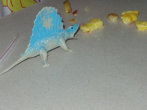 "Oh, no, Hannah! The oviparous beast is attempting to eat your scrambled eggs!"